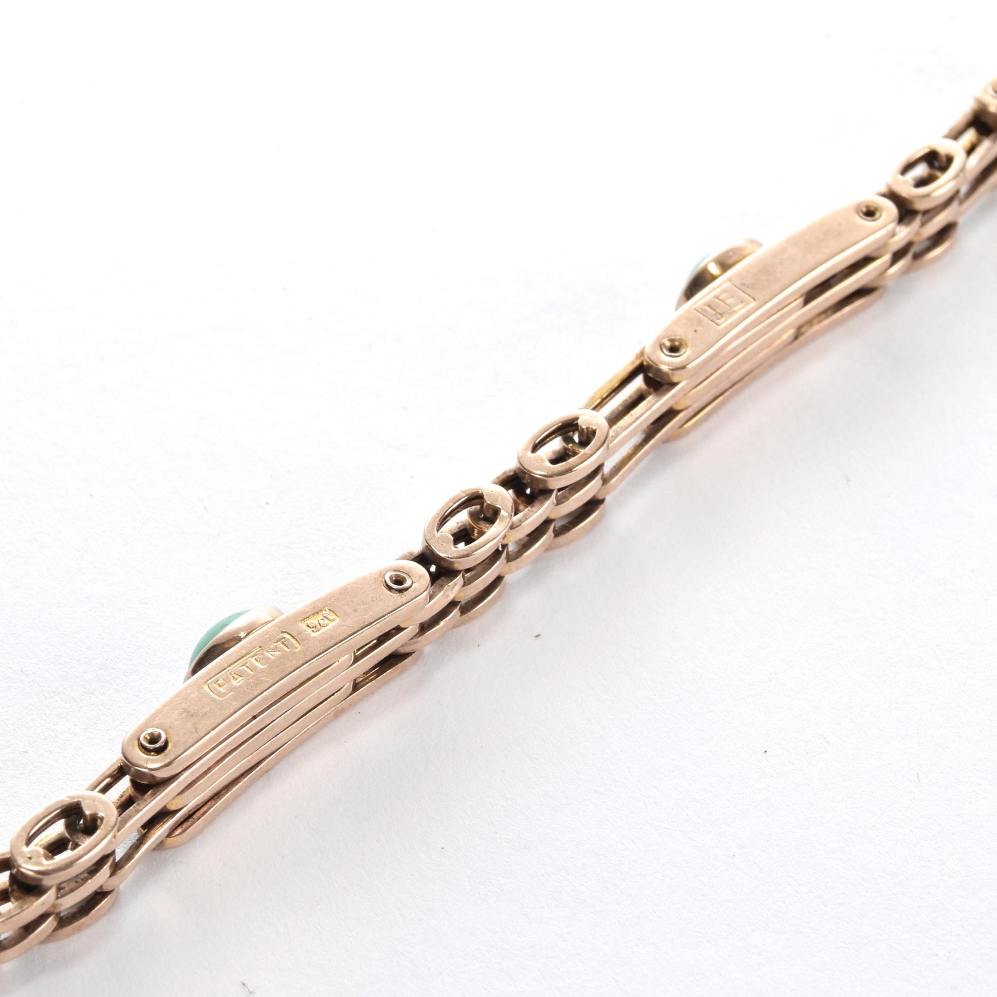 Hallmarked "PATENT 9CT JE" on the side of the bracelet.