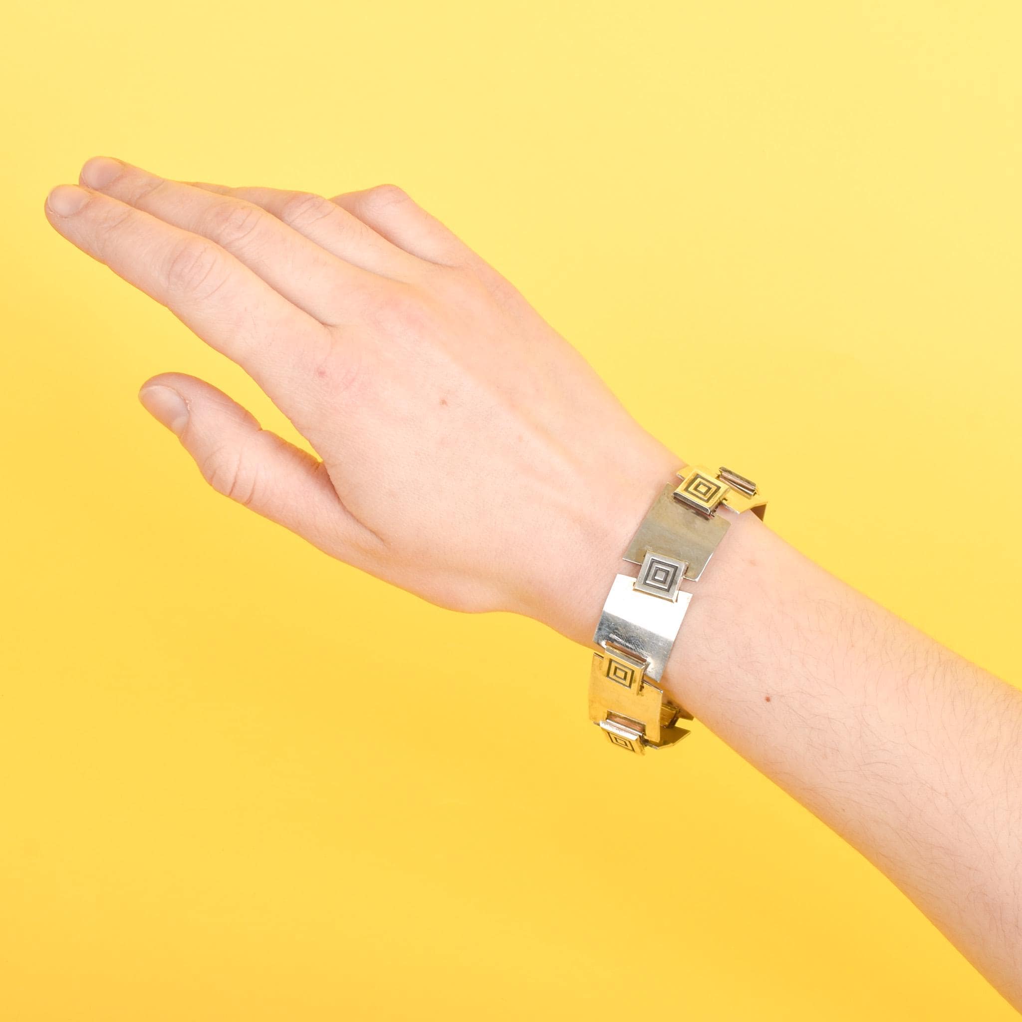 Why we love it: The rectangular links of this bracelet, all slightly different in size and shape, are linked together by etched square links, making this a quintessential modernist bracelet, presumably by the jewelry company Age Fausing.