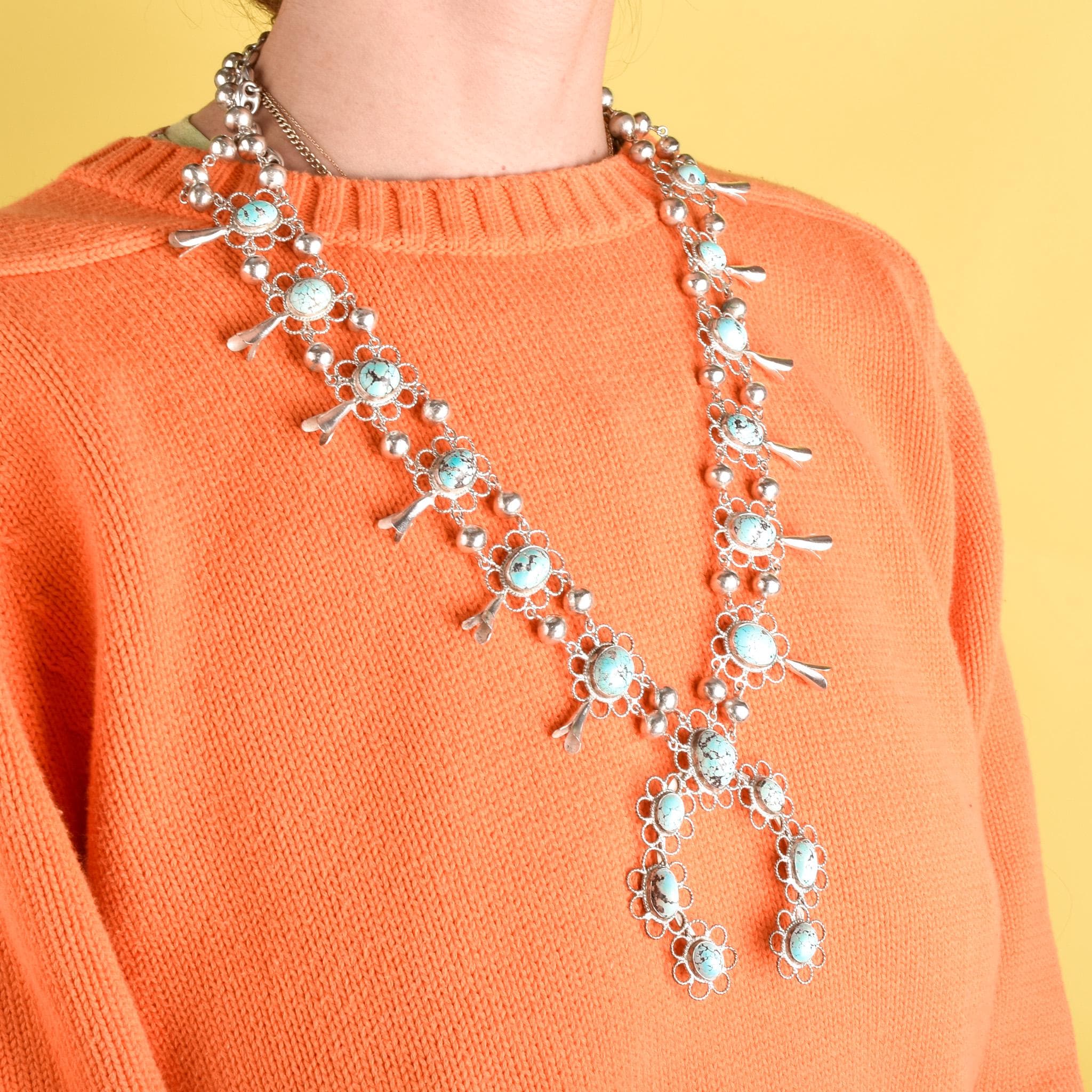 Why we love it: Lighter than most traditional squash blossom necklaces, this piece‘s weight makes it more suitable for wear. The light-toned silver is perfectly complemented by the robin‘s-egg blue turquoise, which are all set with an almost floral design, adding to the uniqueness of this piece.