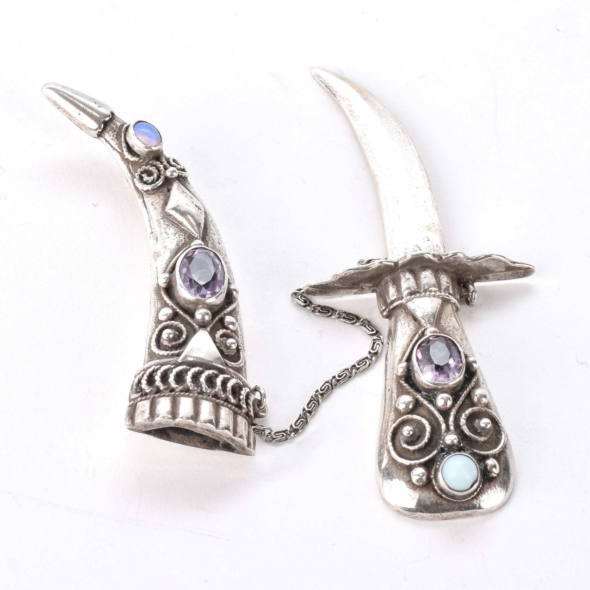 Silver Dagger Brooch with Amethyst, Moonstone, and Mother of Pearl