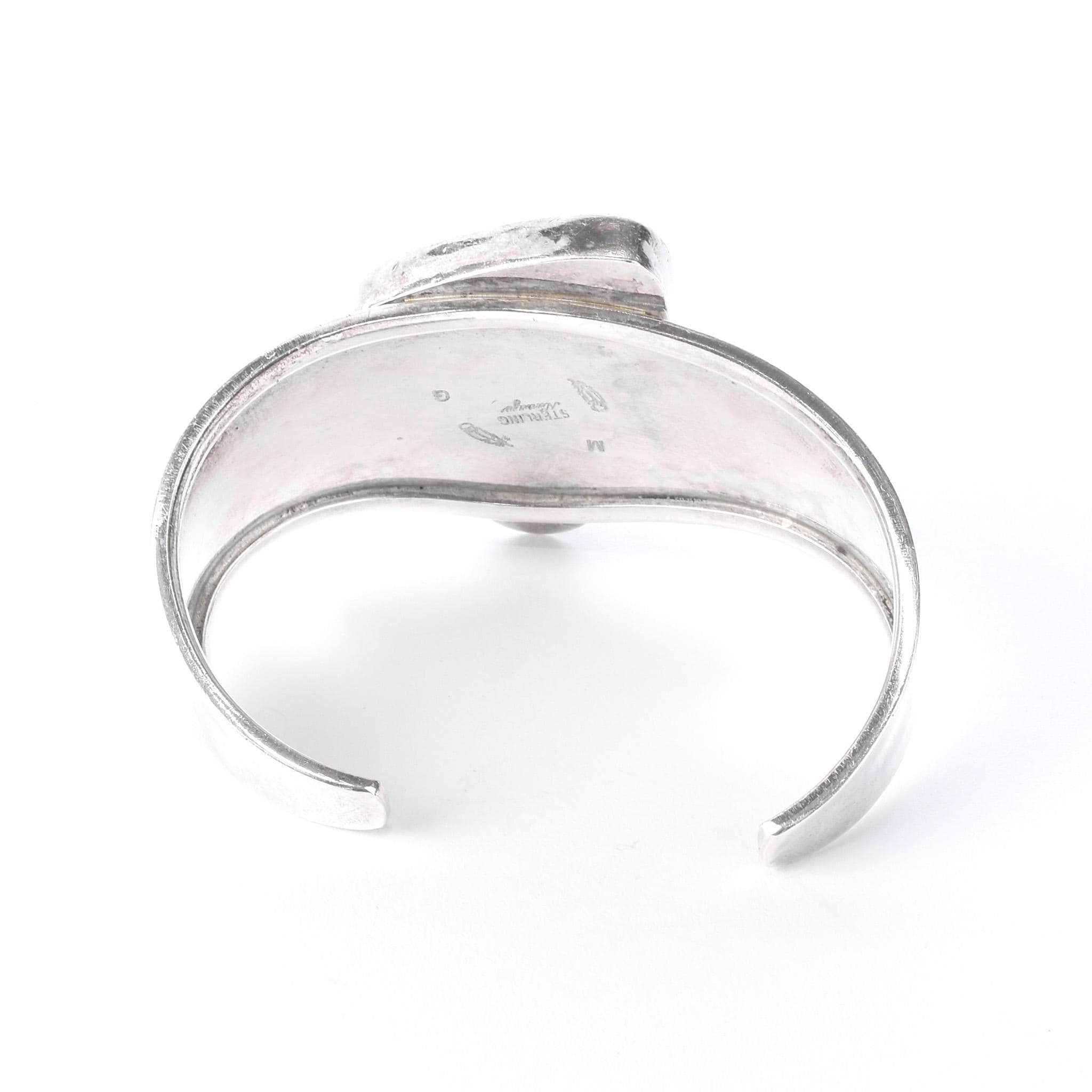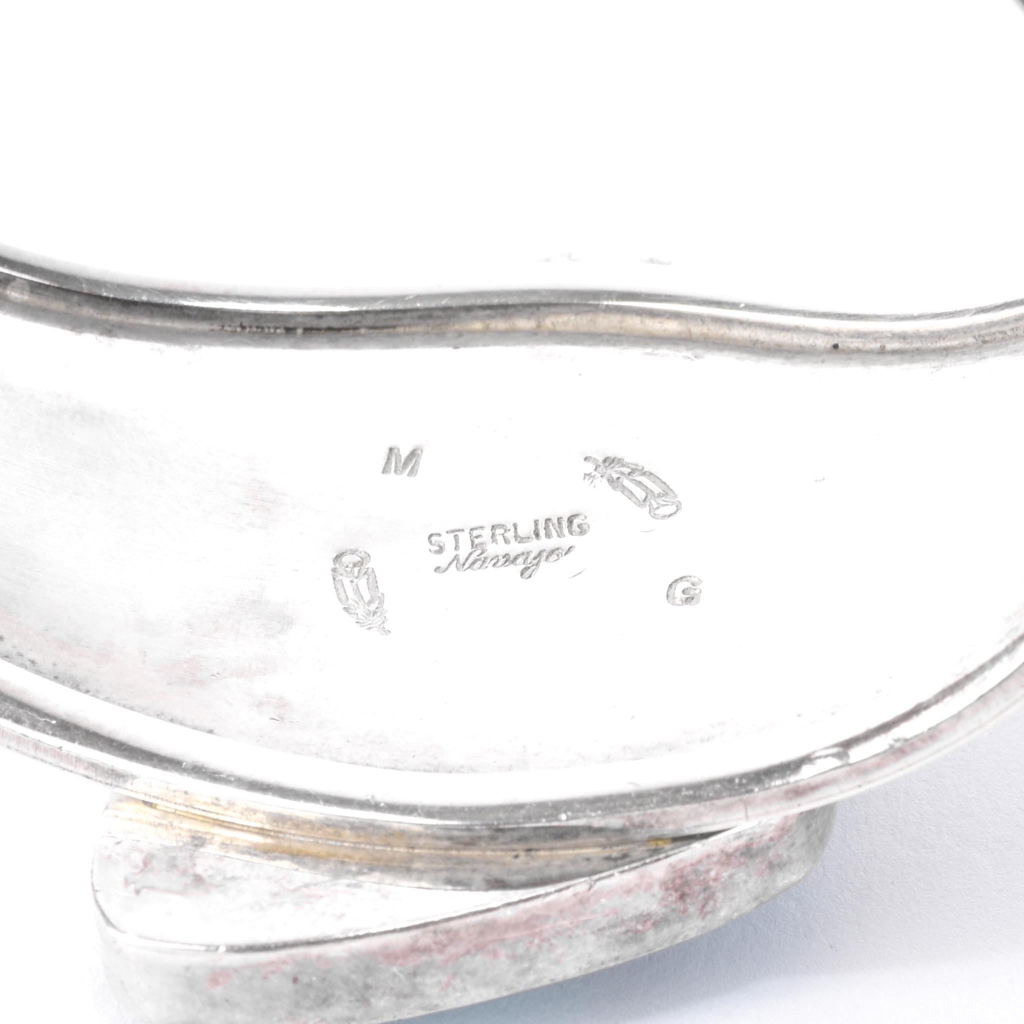 Hallmarked "M STERLING Navajo G" on the inside of the cuff.