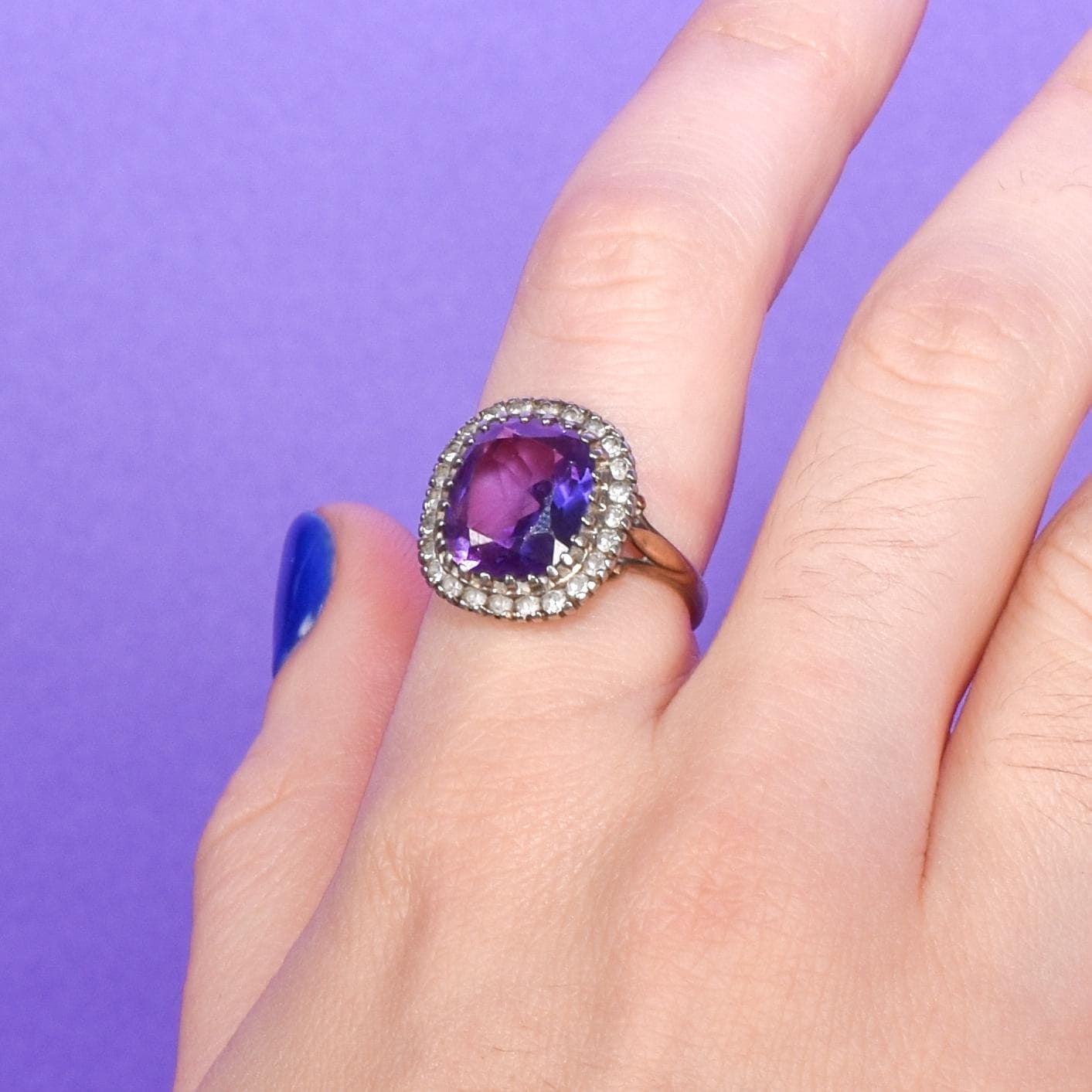 Why we love it: The insanely stunning cut and color of this amethyst is unmatched. Surrounded by shimmering CZ stones and set in a yellow gold band, this Victorian ring is a cherished heirloom that deserves to be treasured.