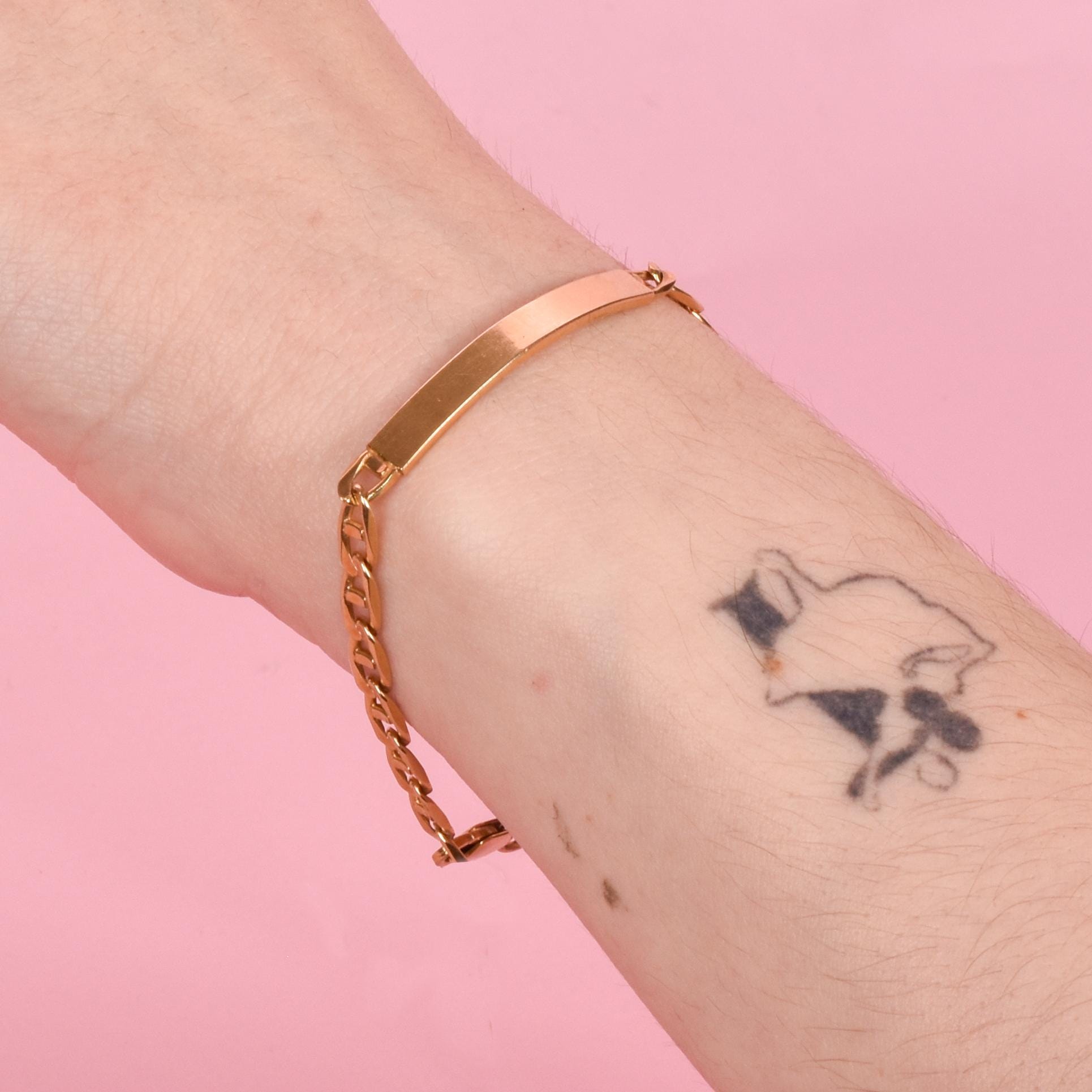Why we love it: A classic bracelet motif. The solid, un-engraved ID plate perfectly matches the lightweight mariner chain. This is the ideal stacking bracelet, and can be engraved or left blank to match your personal style.