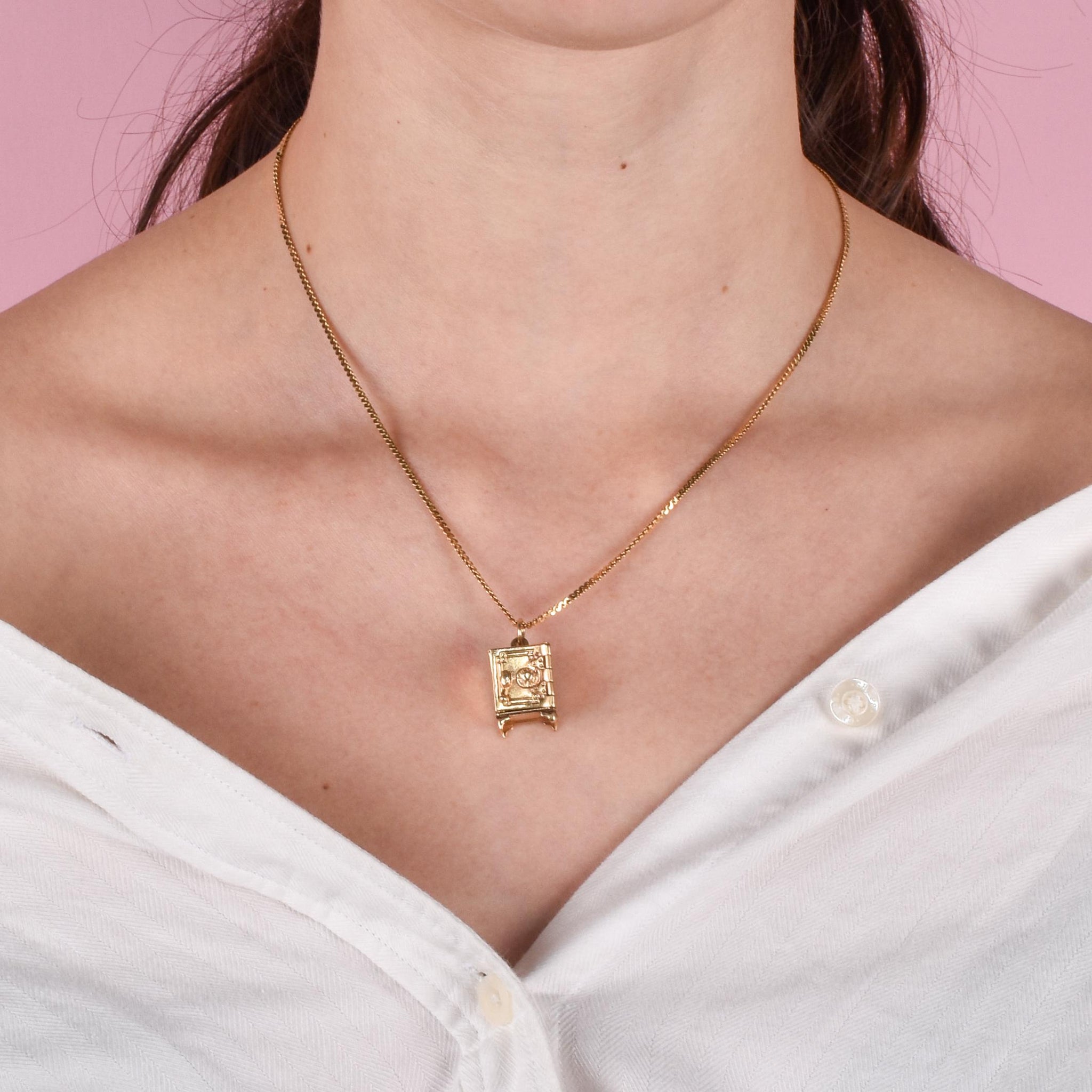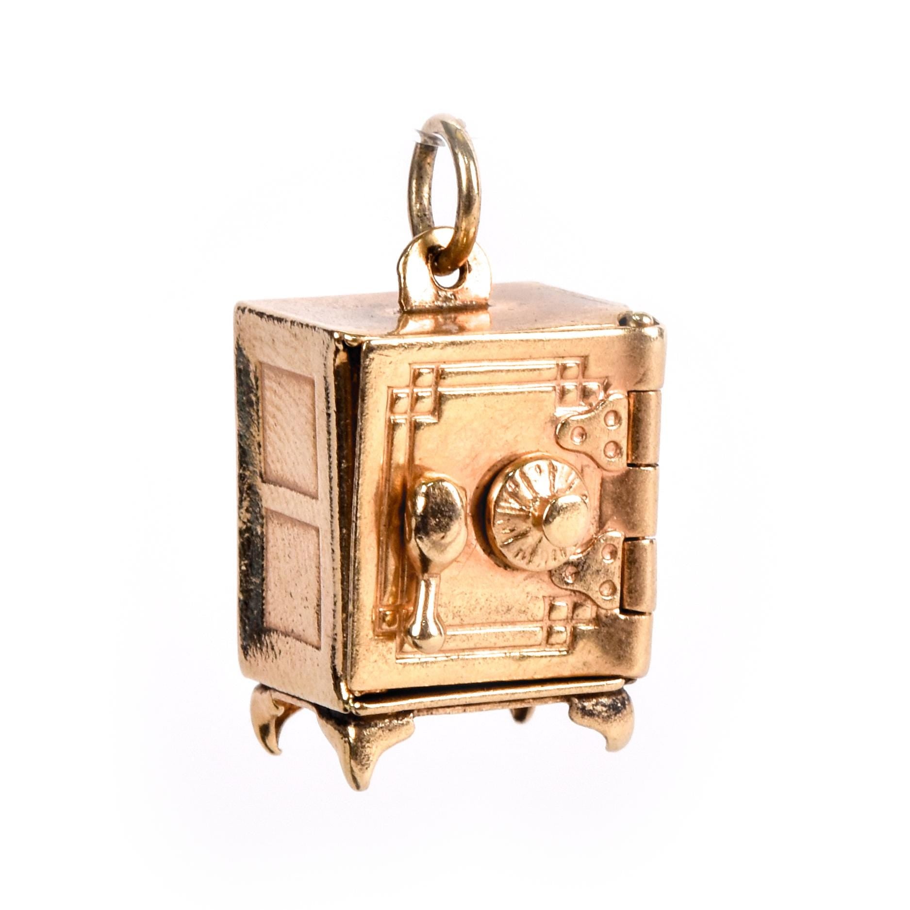Why we love it: A current favorite here at Good‘s. The small gold pendant has a working dial and lever, which, when positioned correctly, opens the vault door, revealing a small emergency dollar. This is an exceptionally cool pendant, and a great addition to any collector.