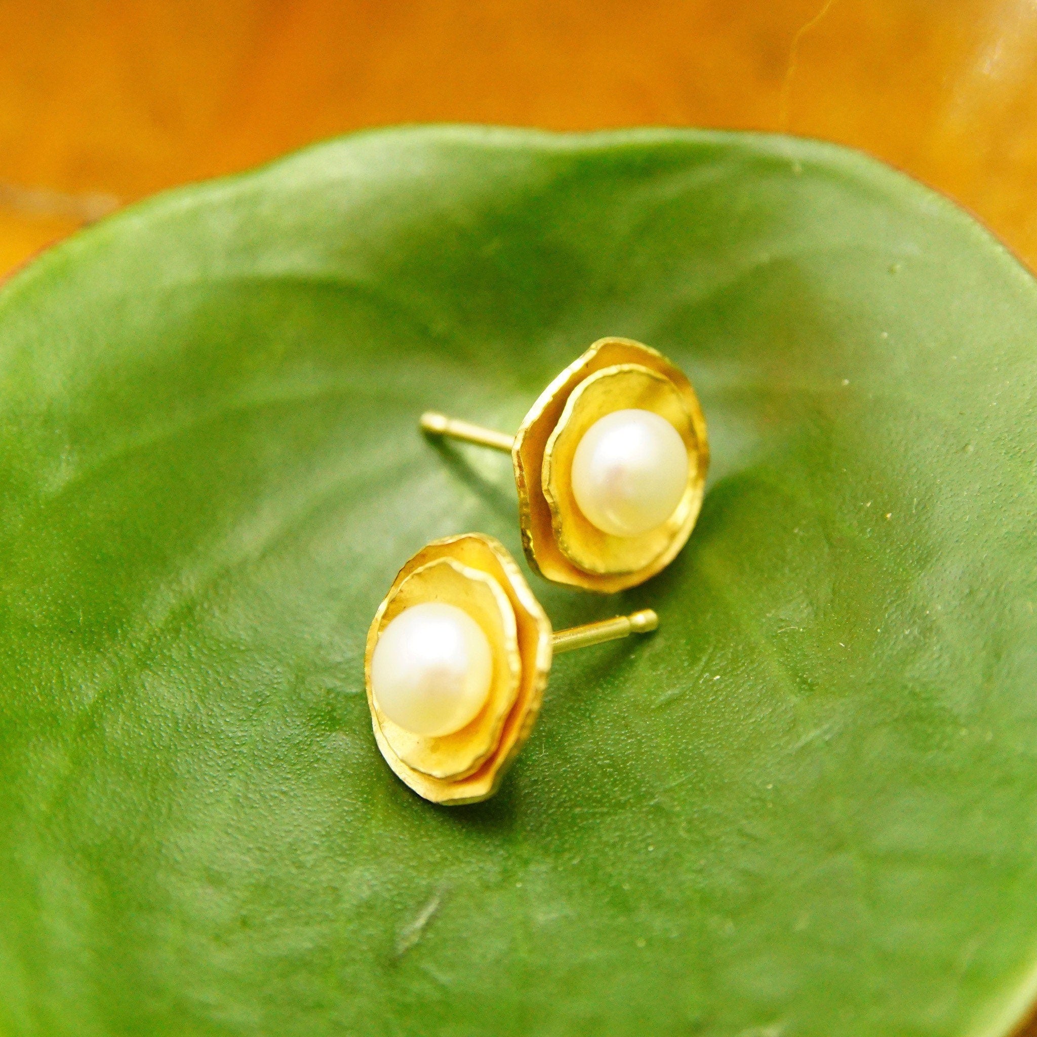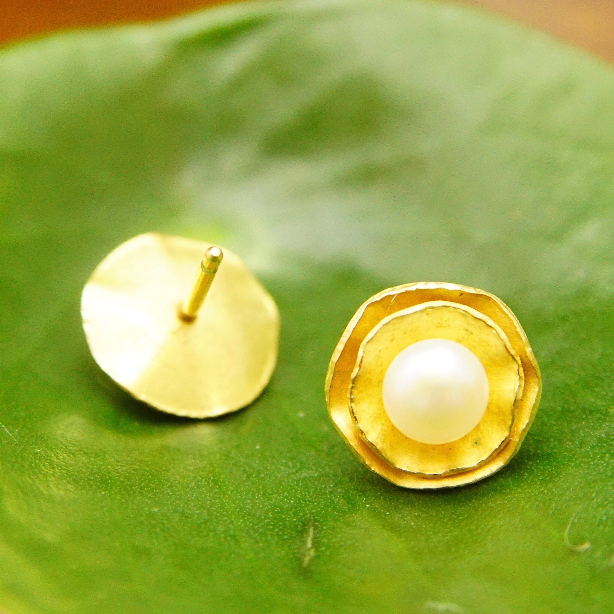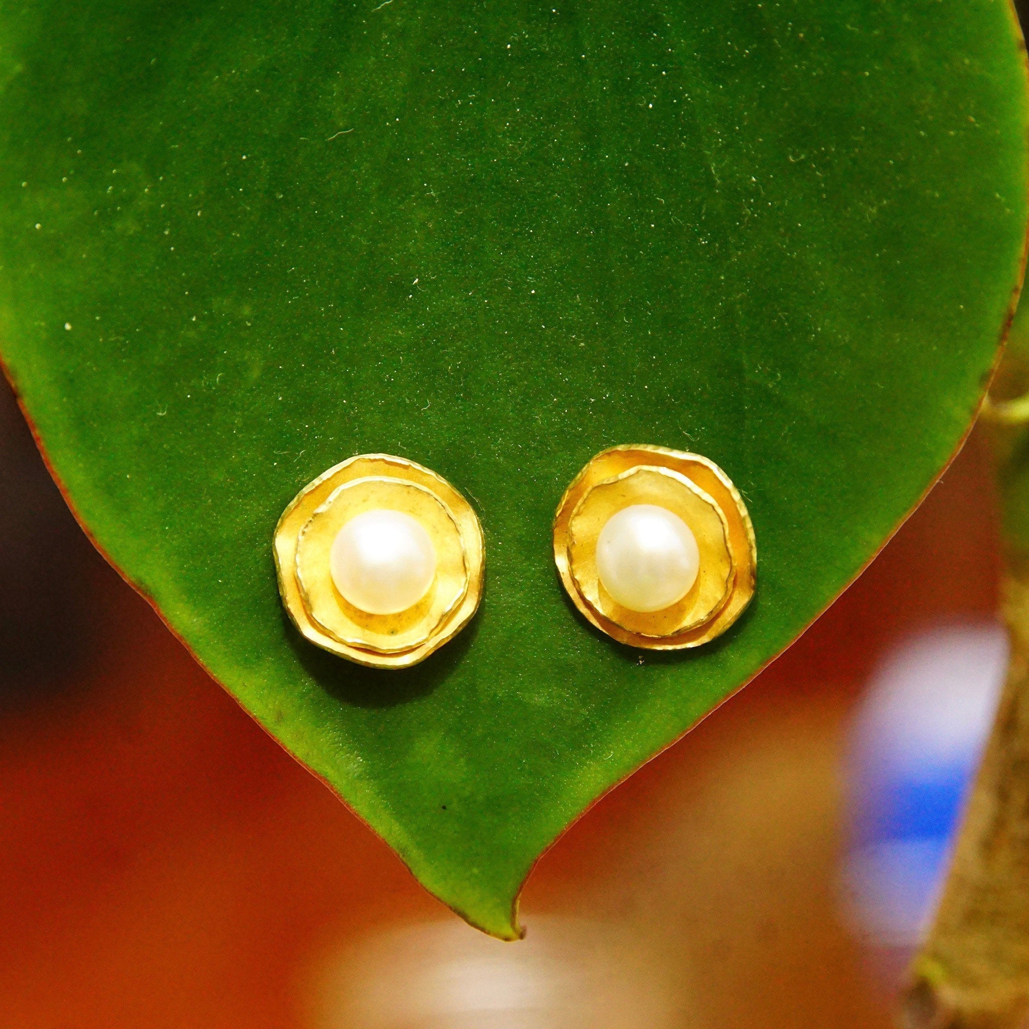 Vintage 18K Yellow Gold Pearl Flower Halo Stud Earring, Elegant Pearl Studs, Gold Foil Petals, Iridescent Round Pearl, 750 AU, 12mm