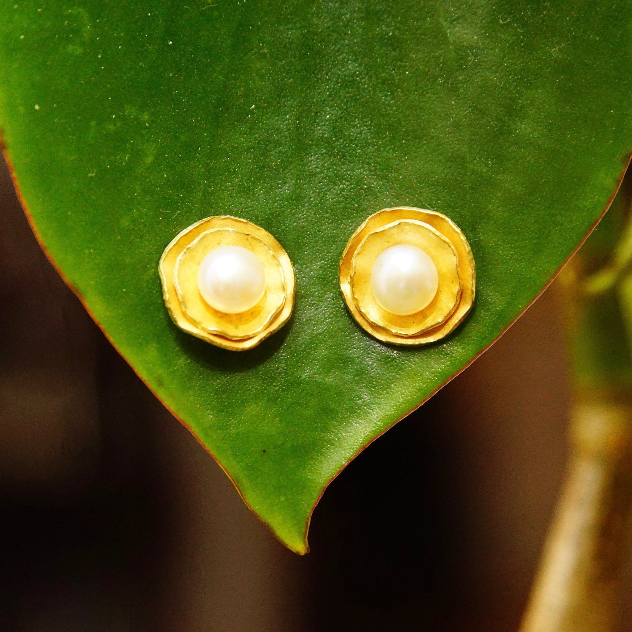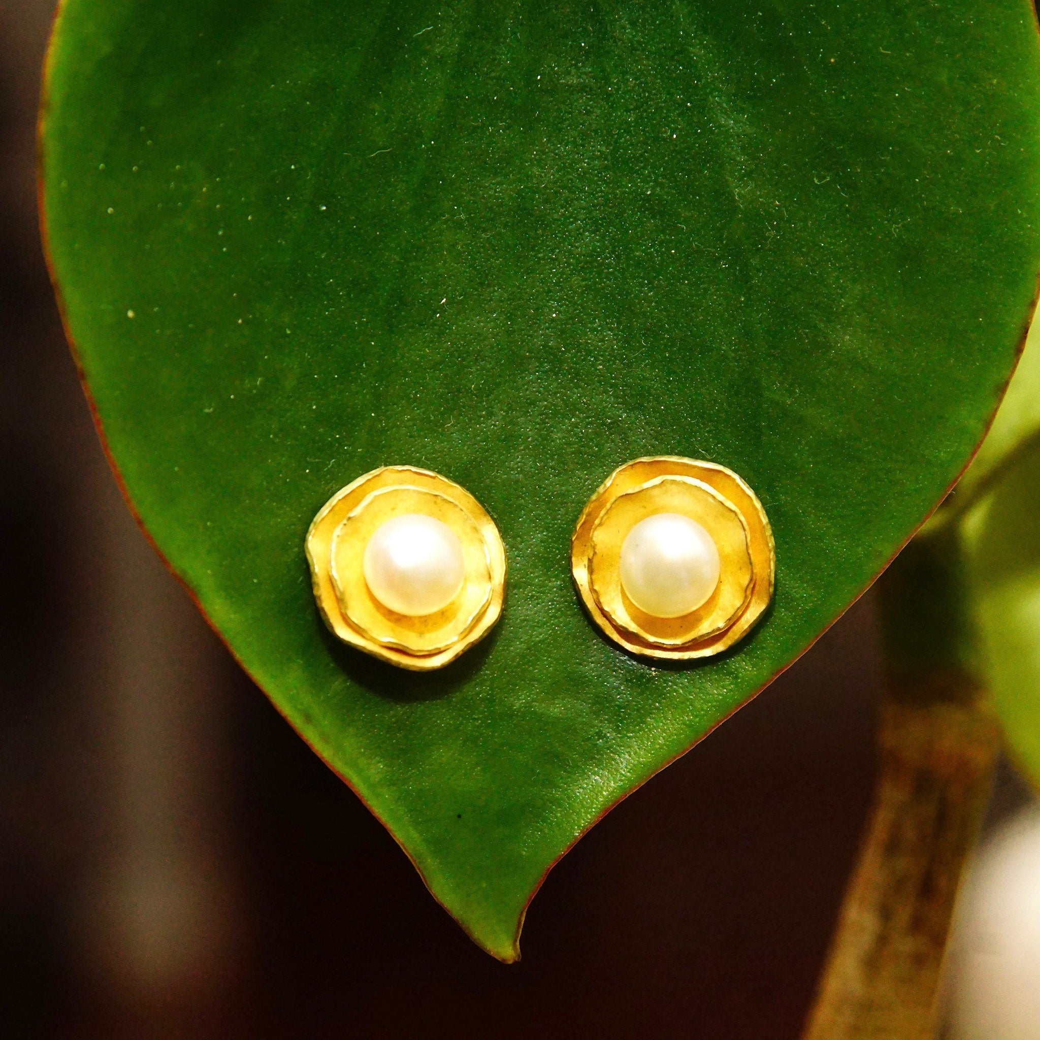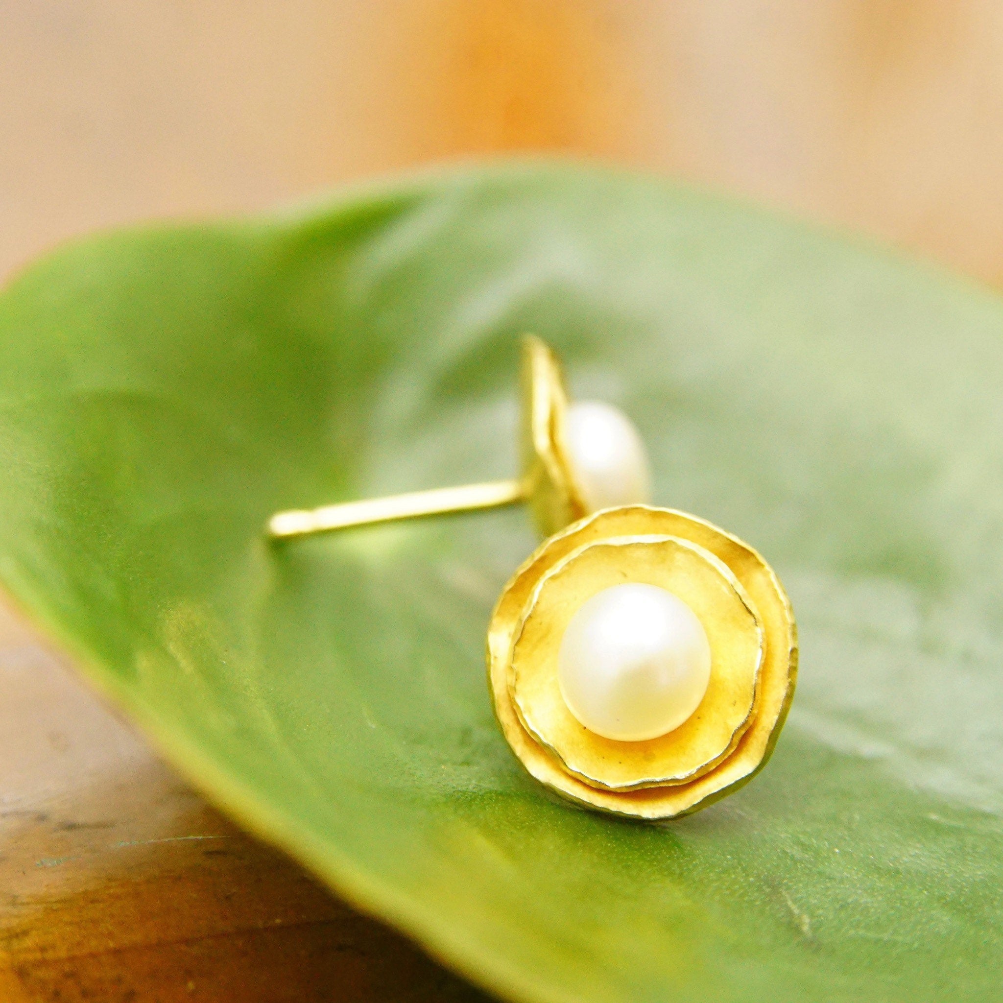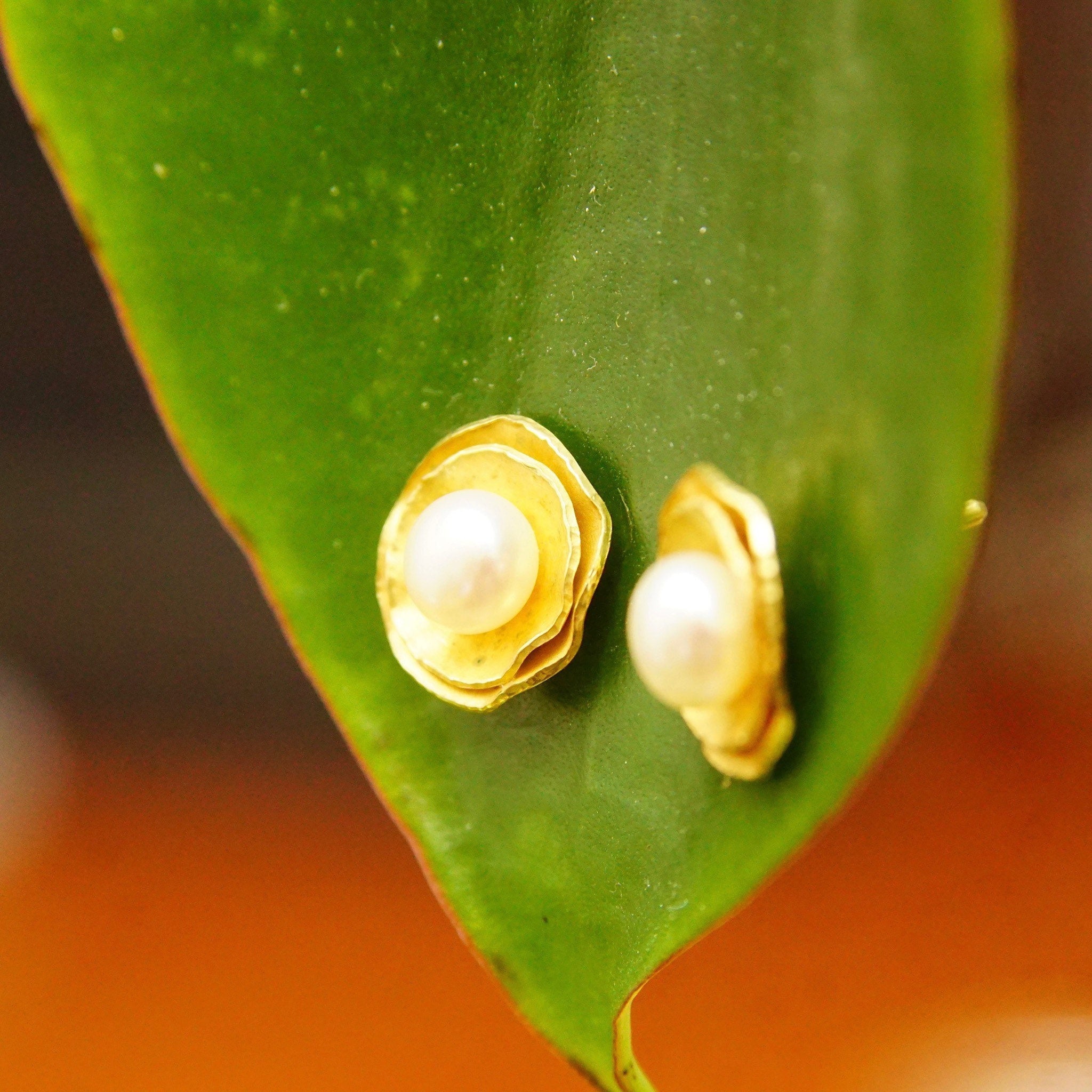 Vintage 18K Yellow Gold Pearl Flower Halo Stud Earring, Elegant Pearl Studs, Gold Foil Petals, Iridescent Round Pearl, 750 AU, 12mm