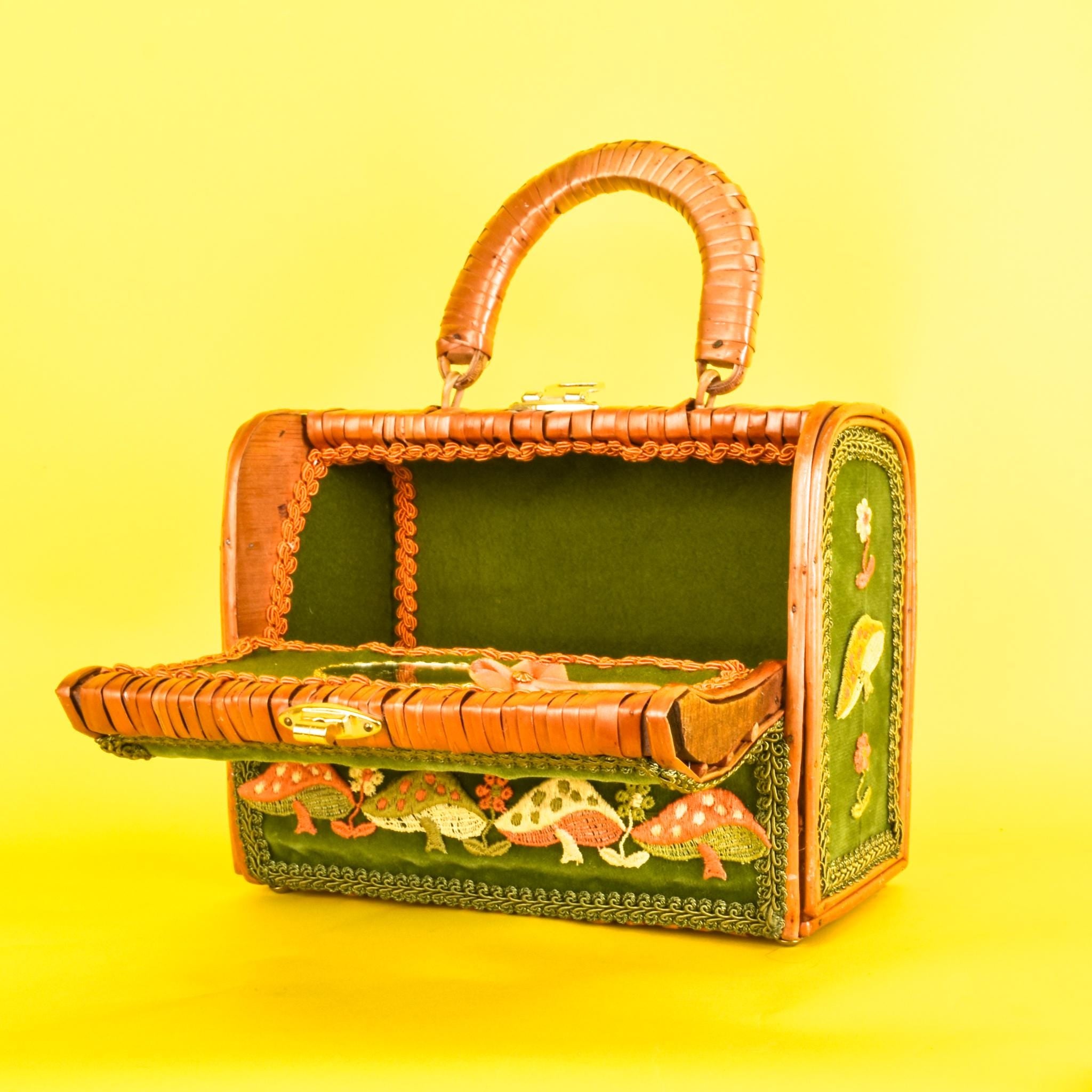1970s Embroidered Mushroom Wicker Box Purse