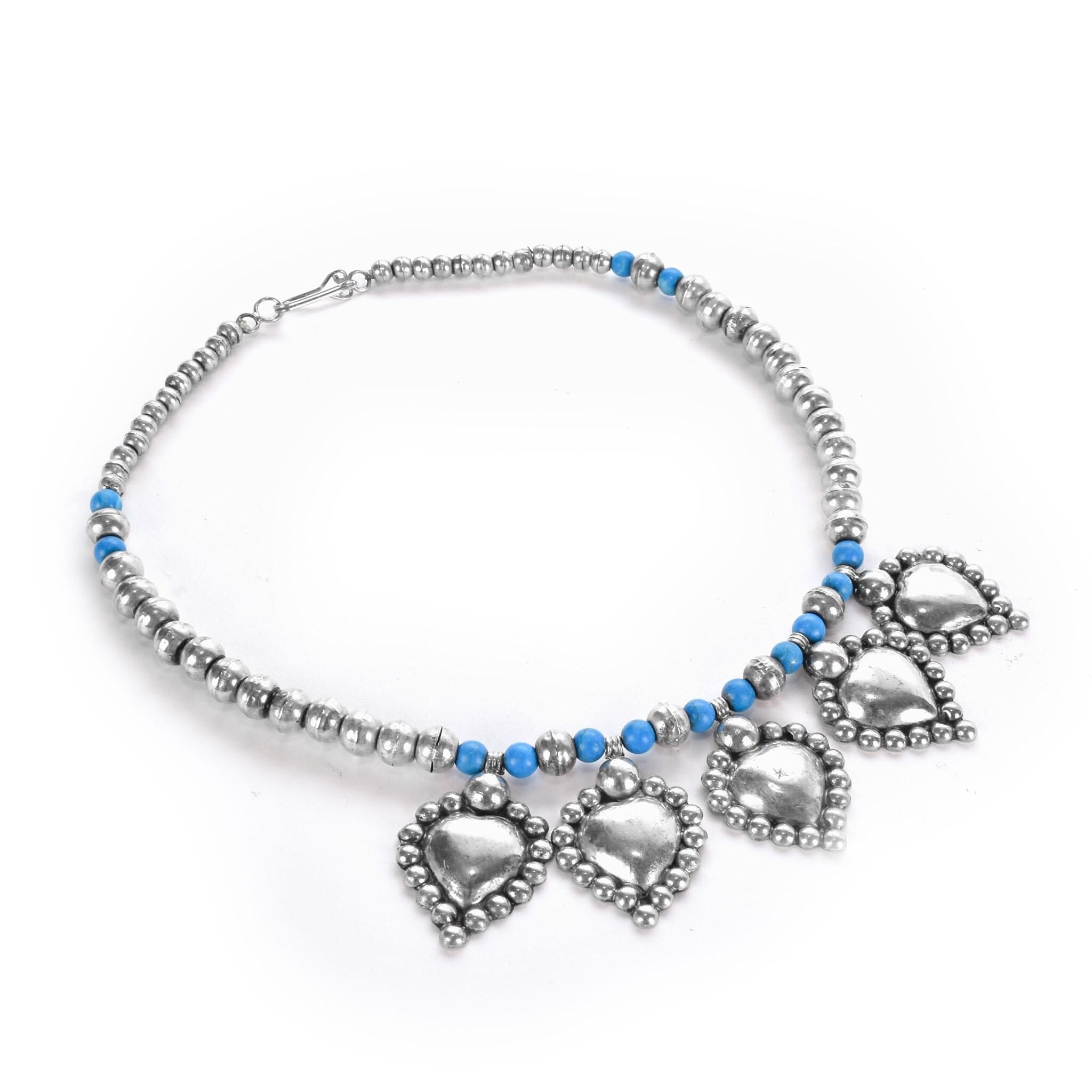 Sterling Silver and Turquoise Beaded Necklace with Large Heart-Shaped Silver Beads