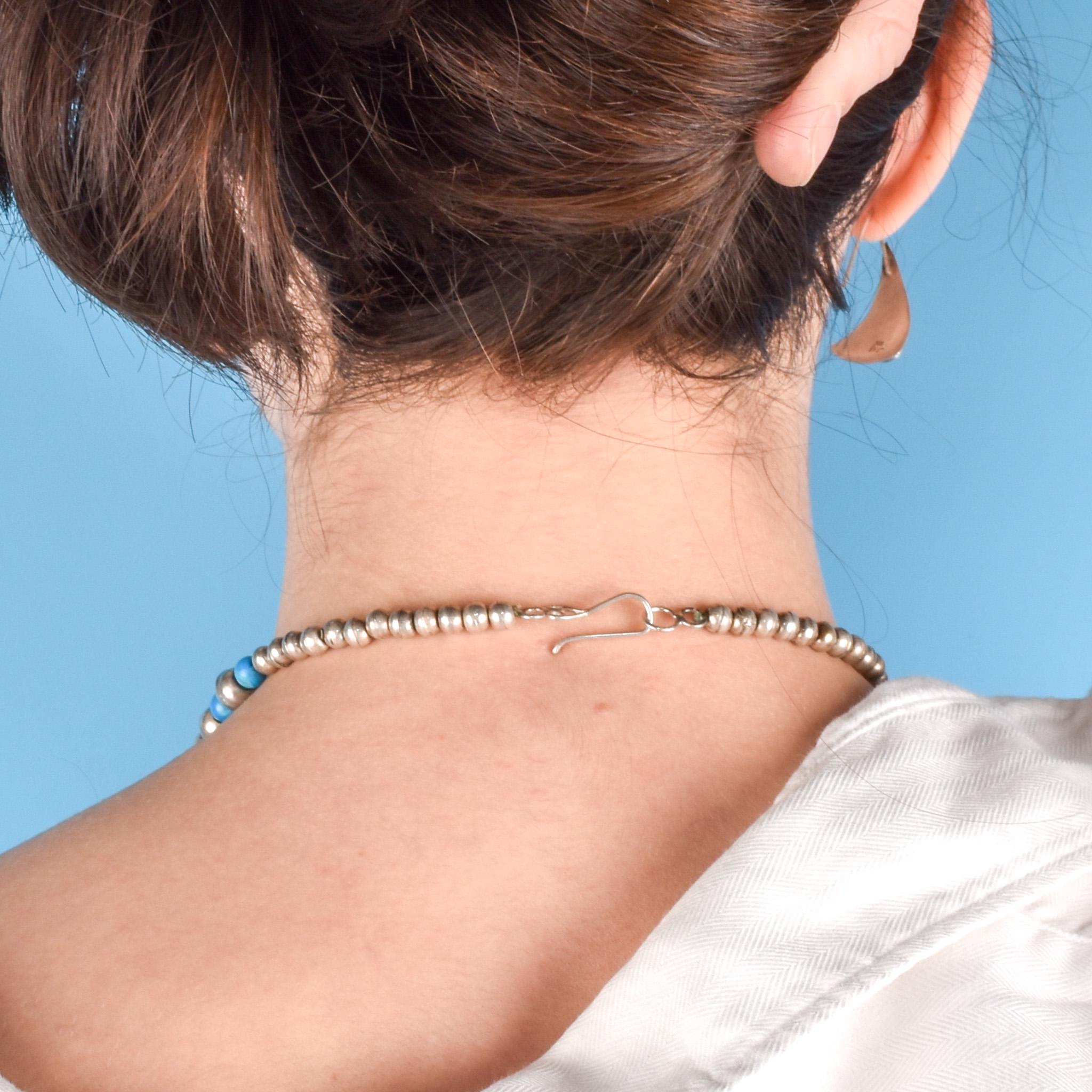 Why we love it: This is such a cool necklace. Large sterling silver and turquoise beads are strung together with 5 incredible silver heart pendants. Strung on a plastic cord, this is an exceptionally unique native necklace and an incredible addition to any collection.