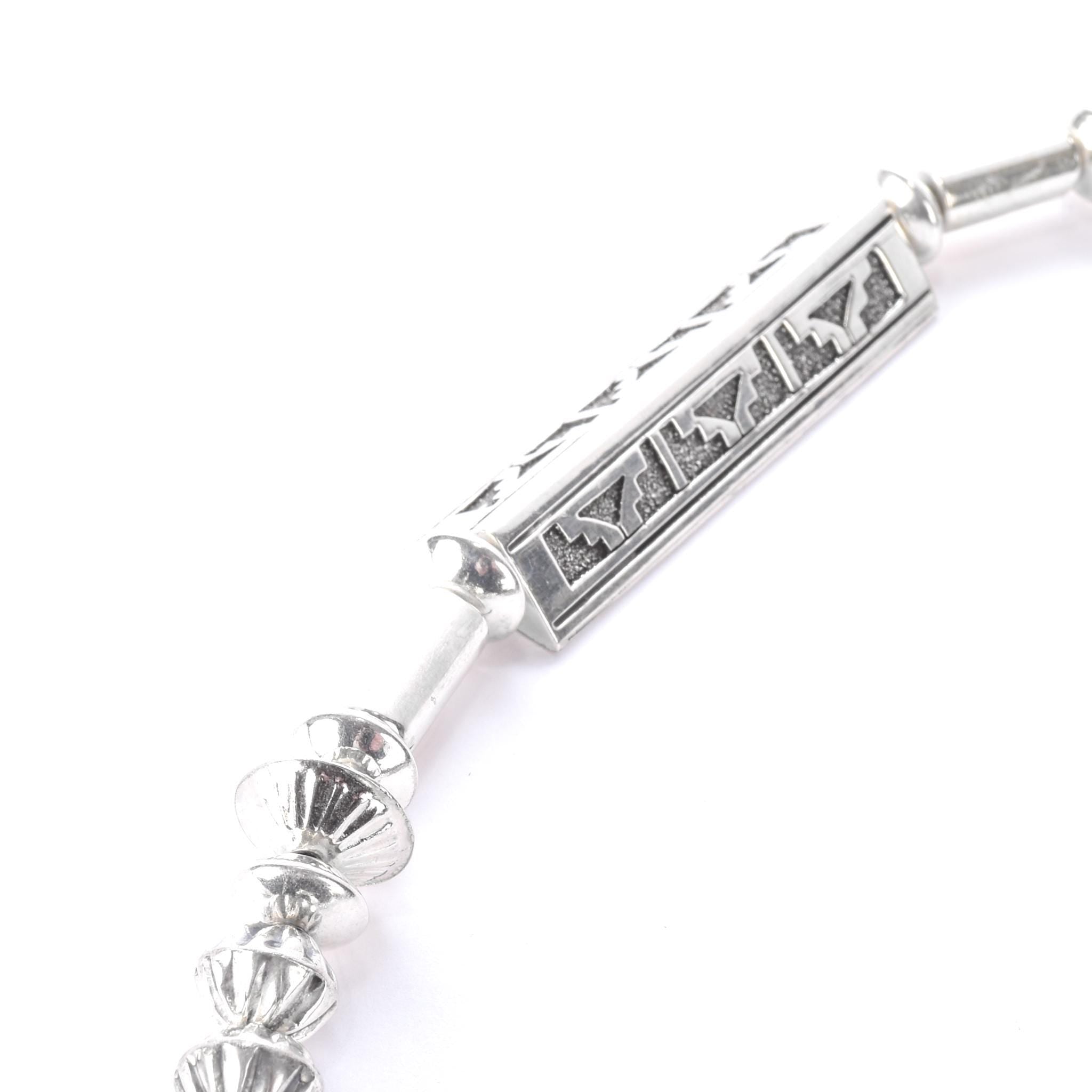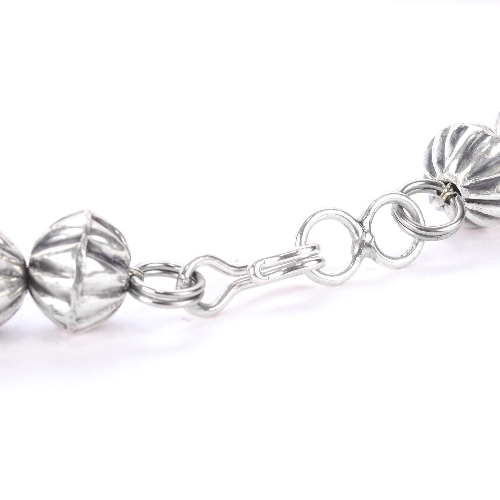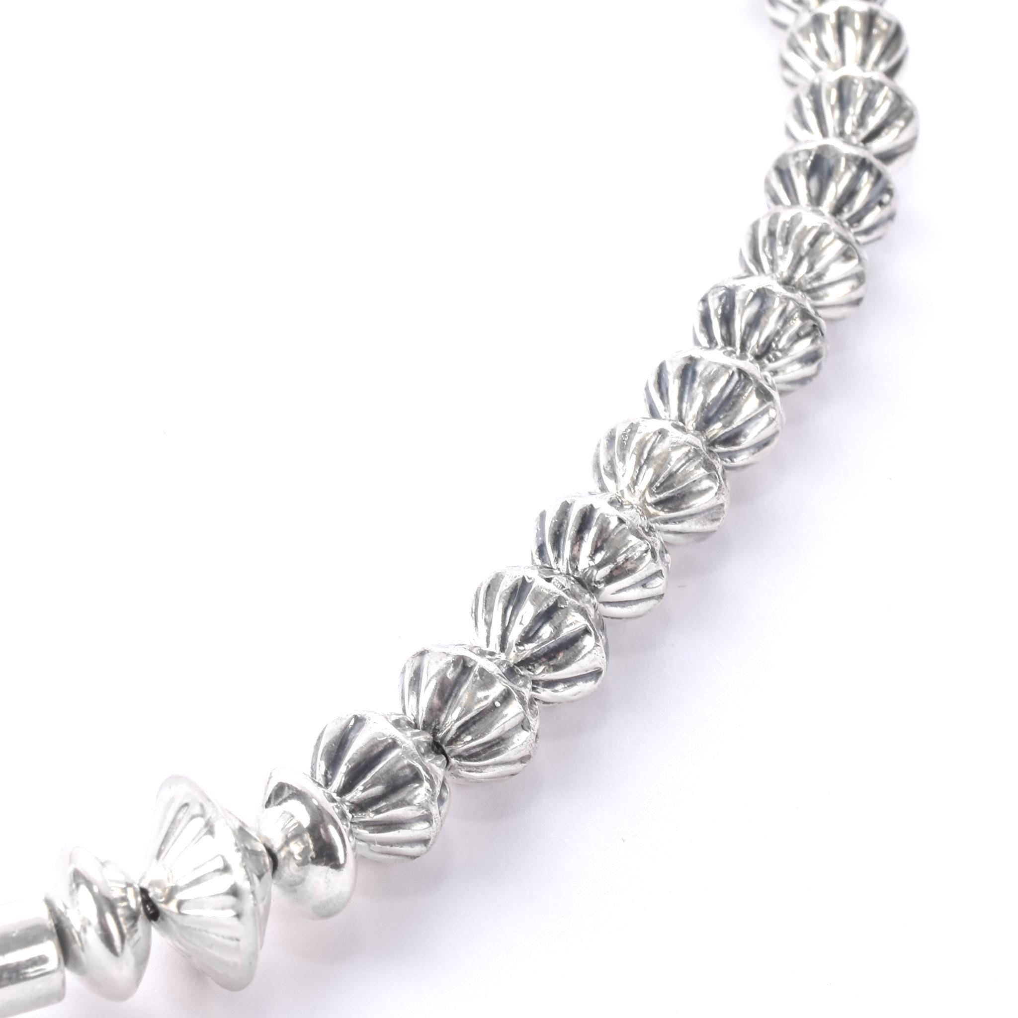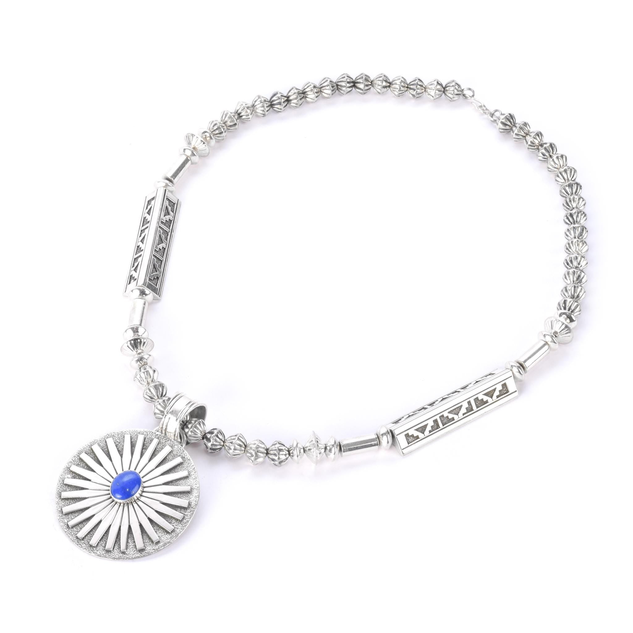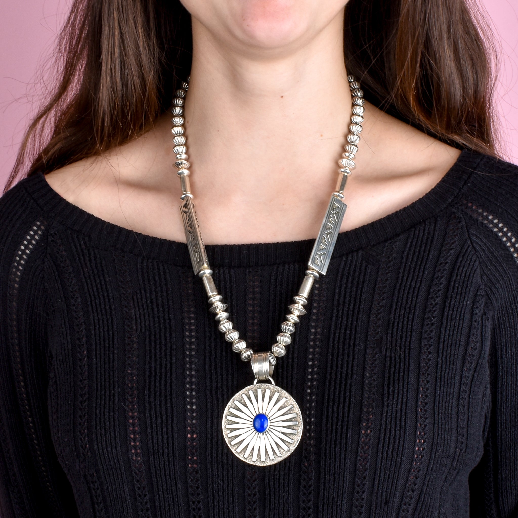 Why we love it: Designed in the 70s-80s by Navajo silversmith Richard Wiley, this necklace features etched bench beads, with large etched triangular beads creating a wholly unique chain. At the center of this chain hangs a large round pendant with a small center lapis stone, adding a dash of color to this piece.