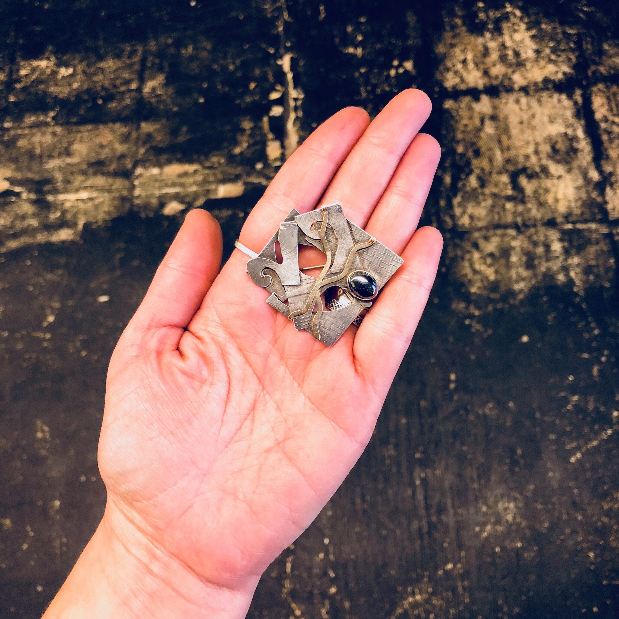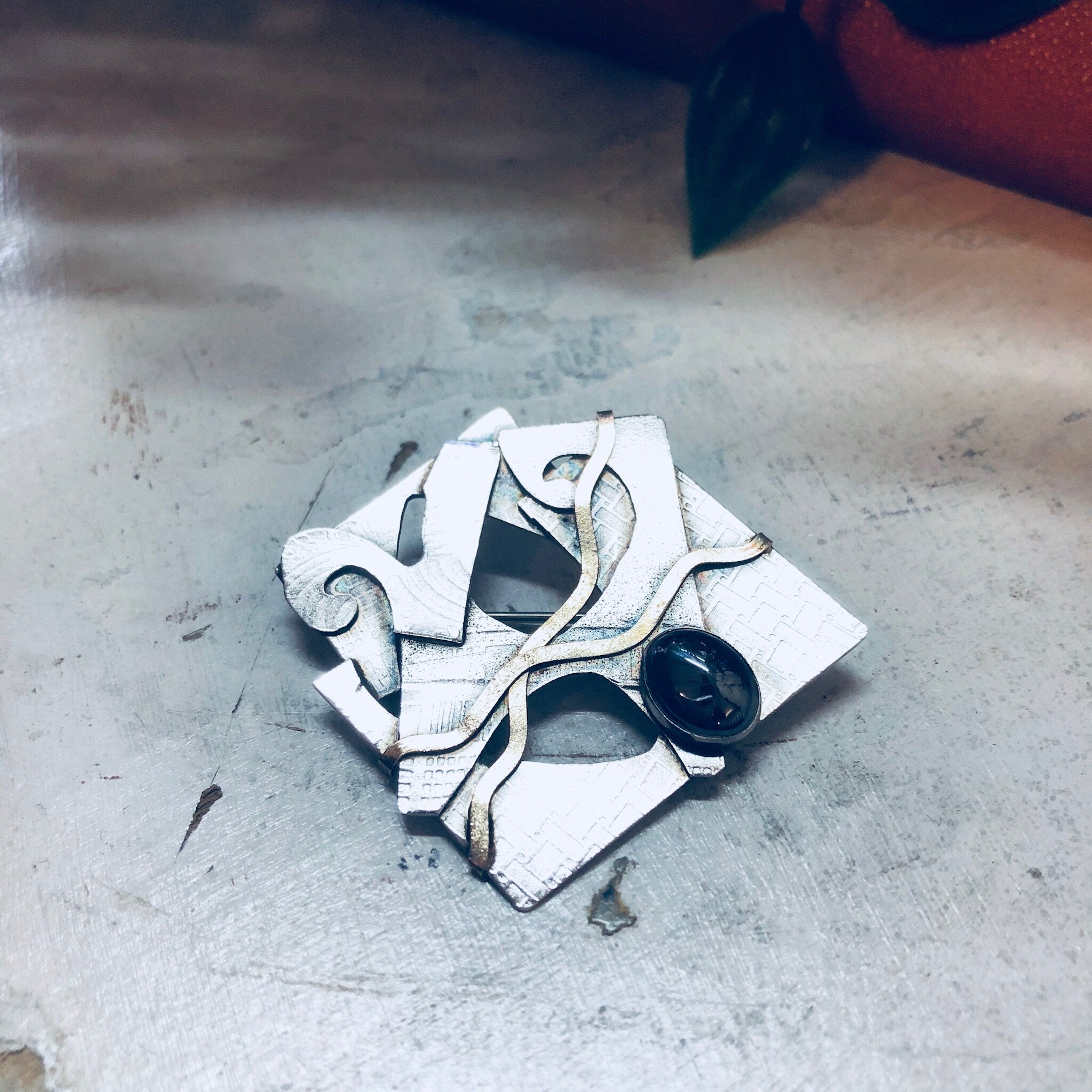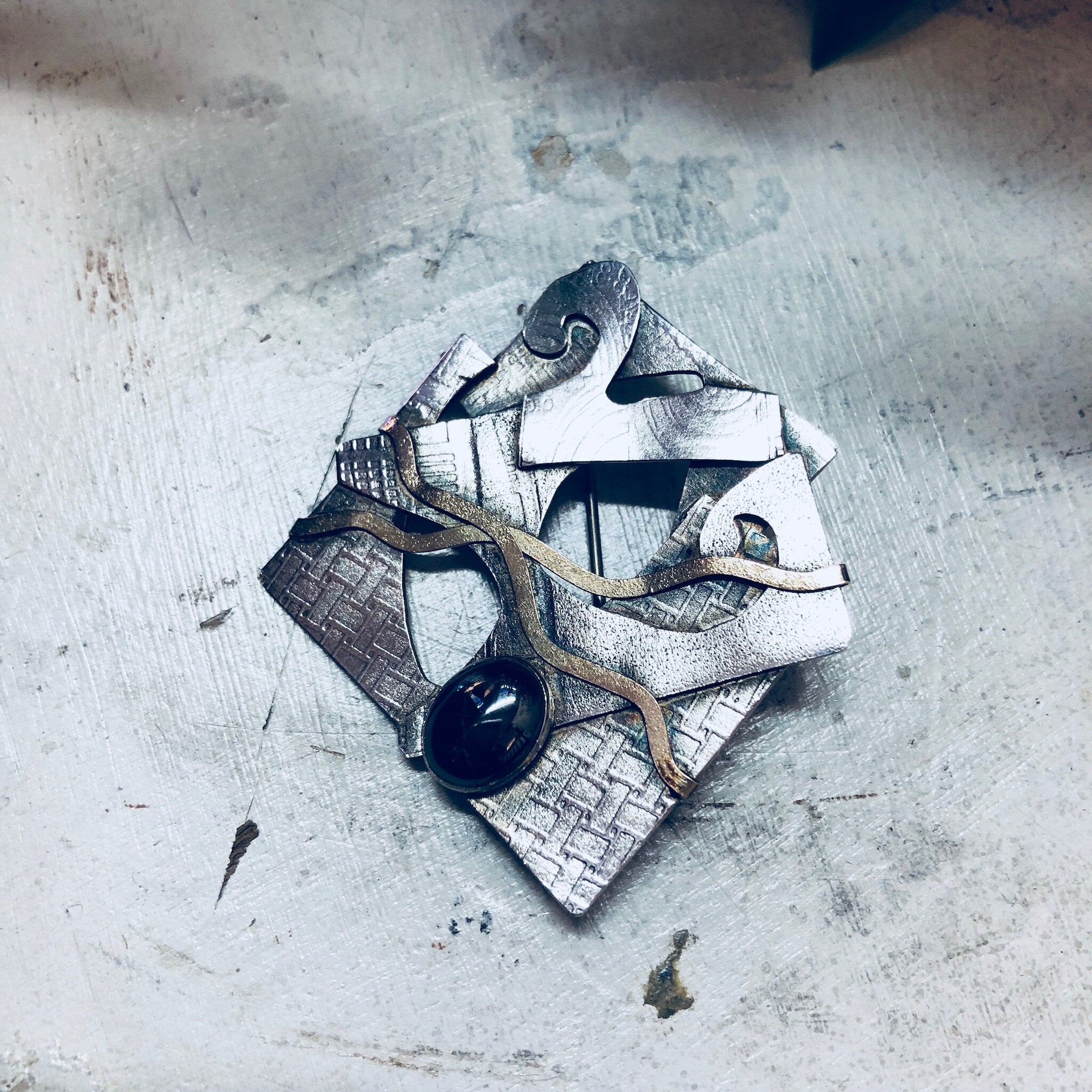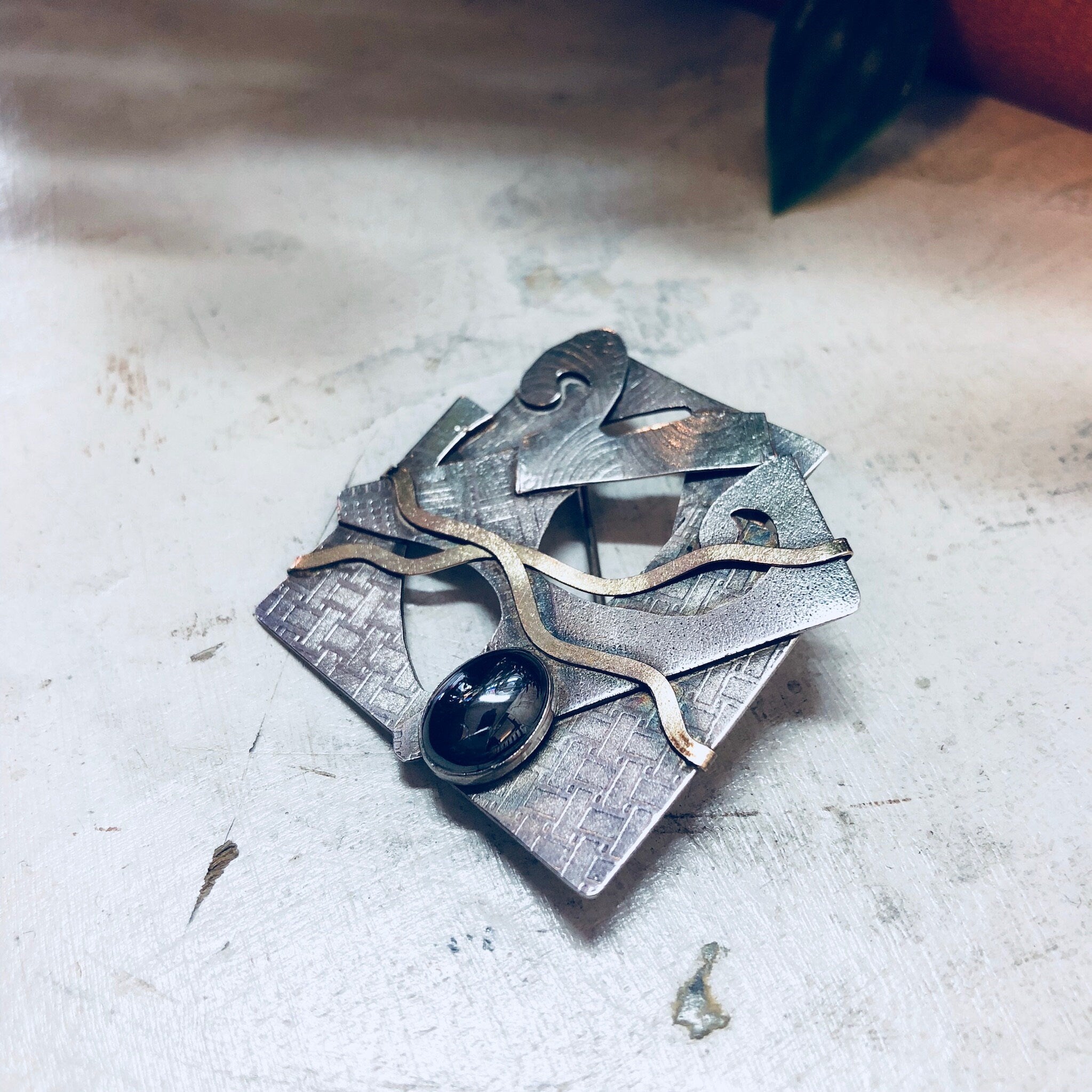 Vintage Silver Brooch, Sterling Silver, Vintage Jewelry, Hematite Jewelry, Hematite Brooch, Cabochon Hematite, Handmade Brooch, Textured Pin
