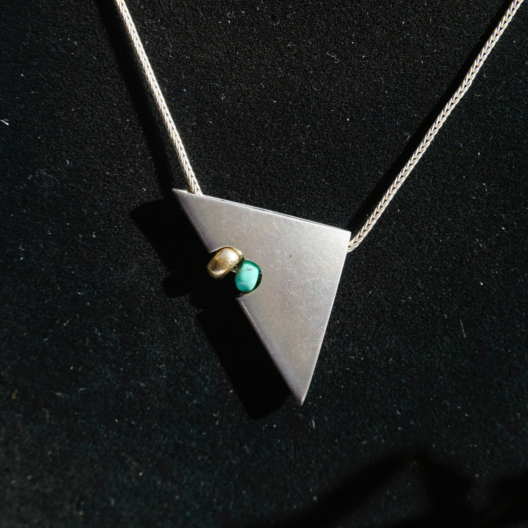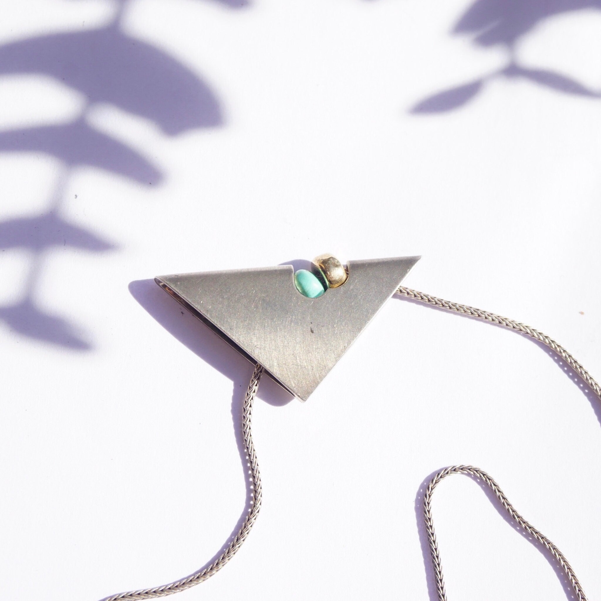 Vintage Silver Necklace With Unique Triangle Pendant, Silver Pendant With Turquoise and Gold Bead, Silver Rope Chain, Abstract Jewelry, 925