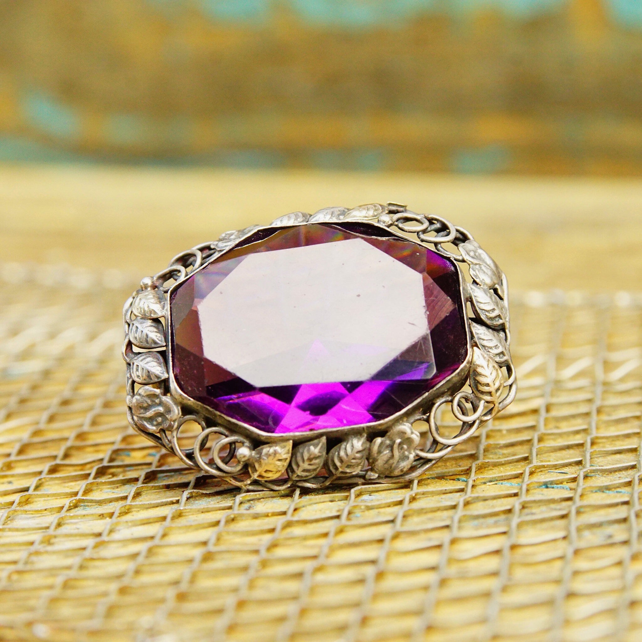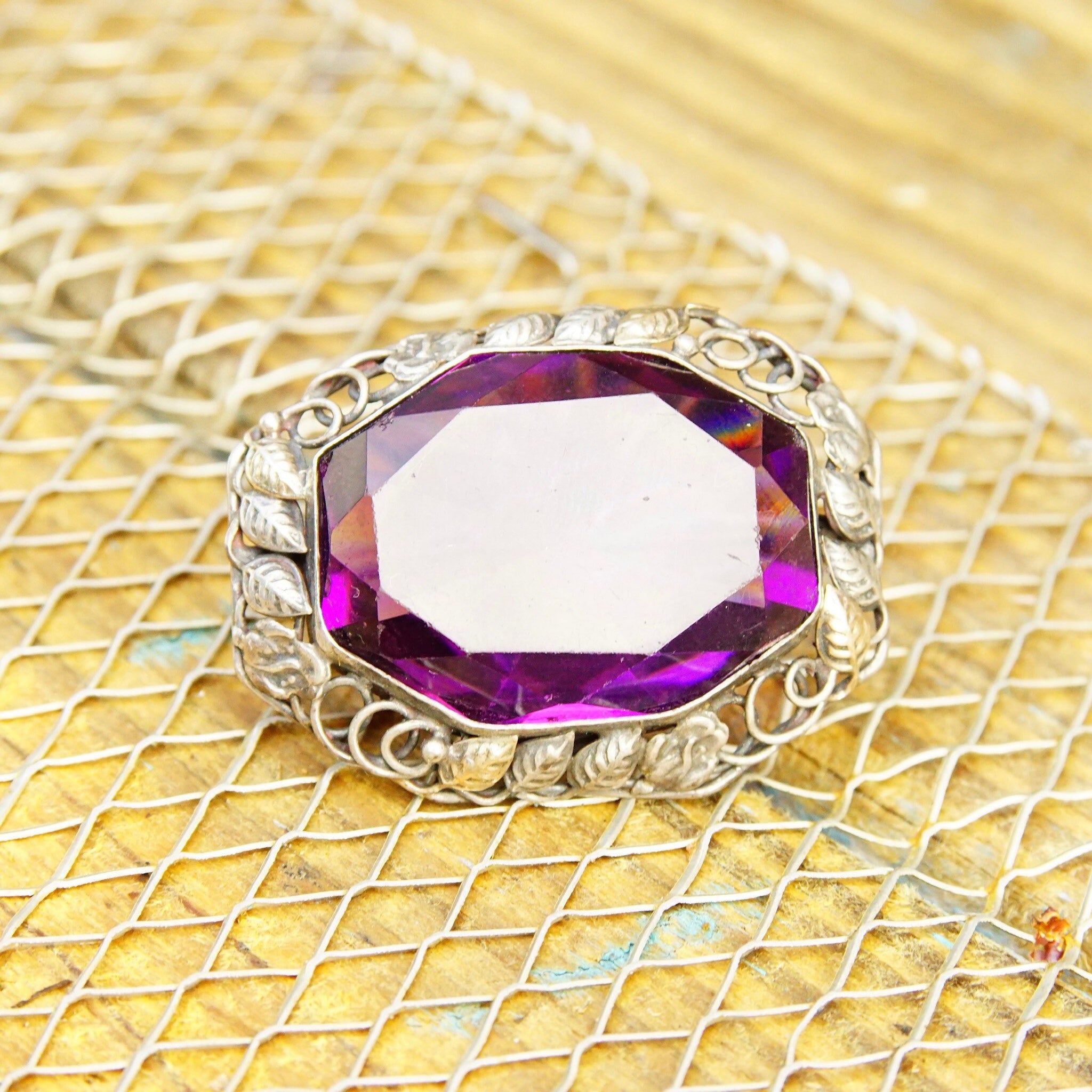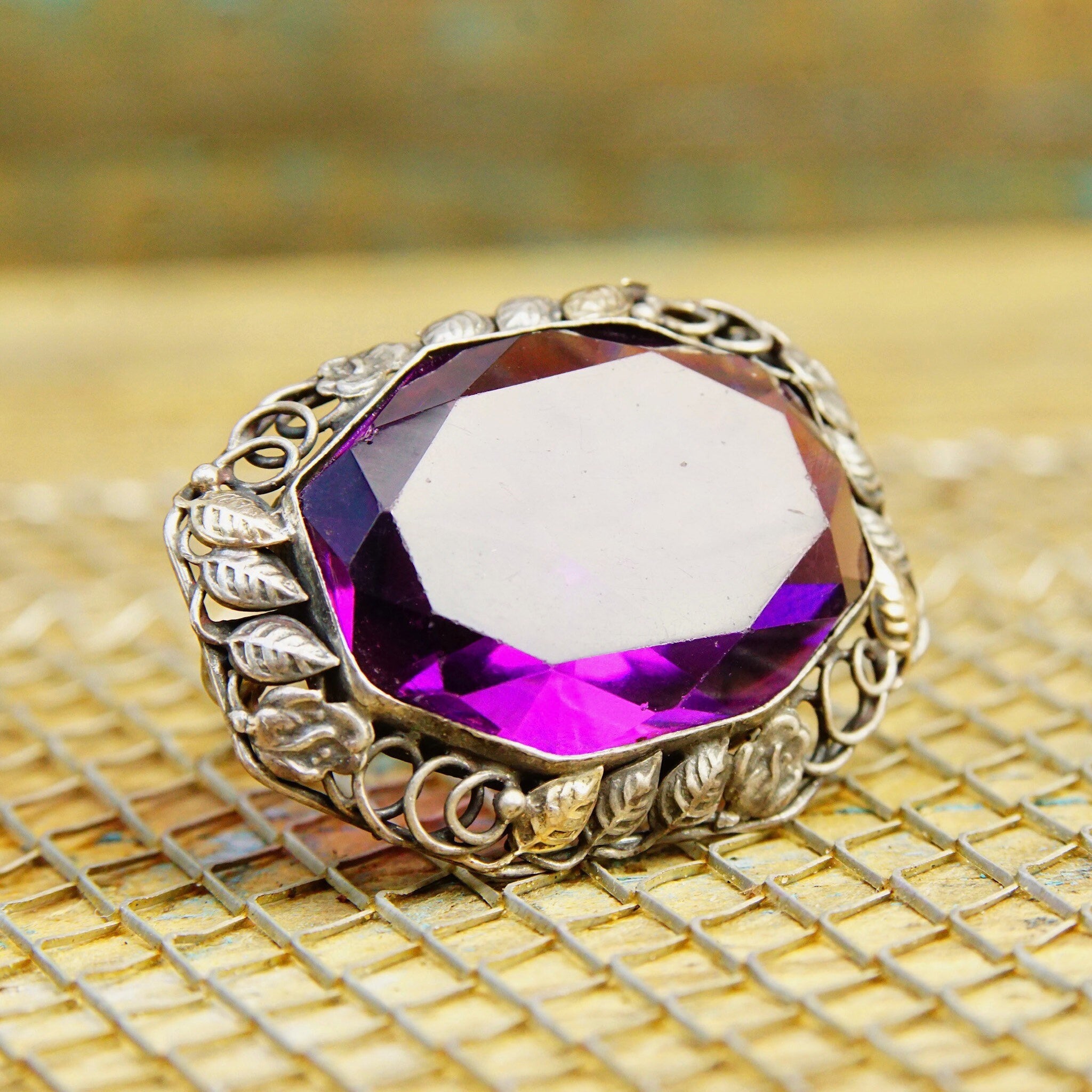 Vintage Sterling Silver Amethyst Brooch, Silver Leaf Frame, Large Faceted Purple Gemstone, Beautiful Amethyst Pin, 1 1/2 W x 1 1/8 L