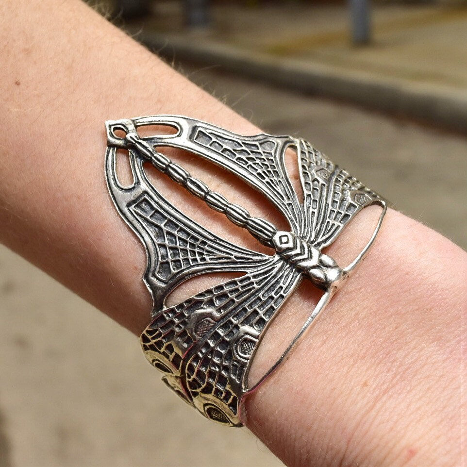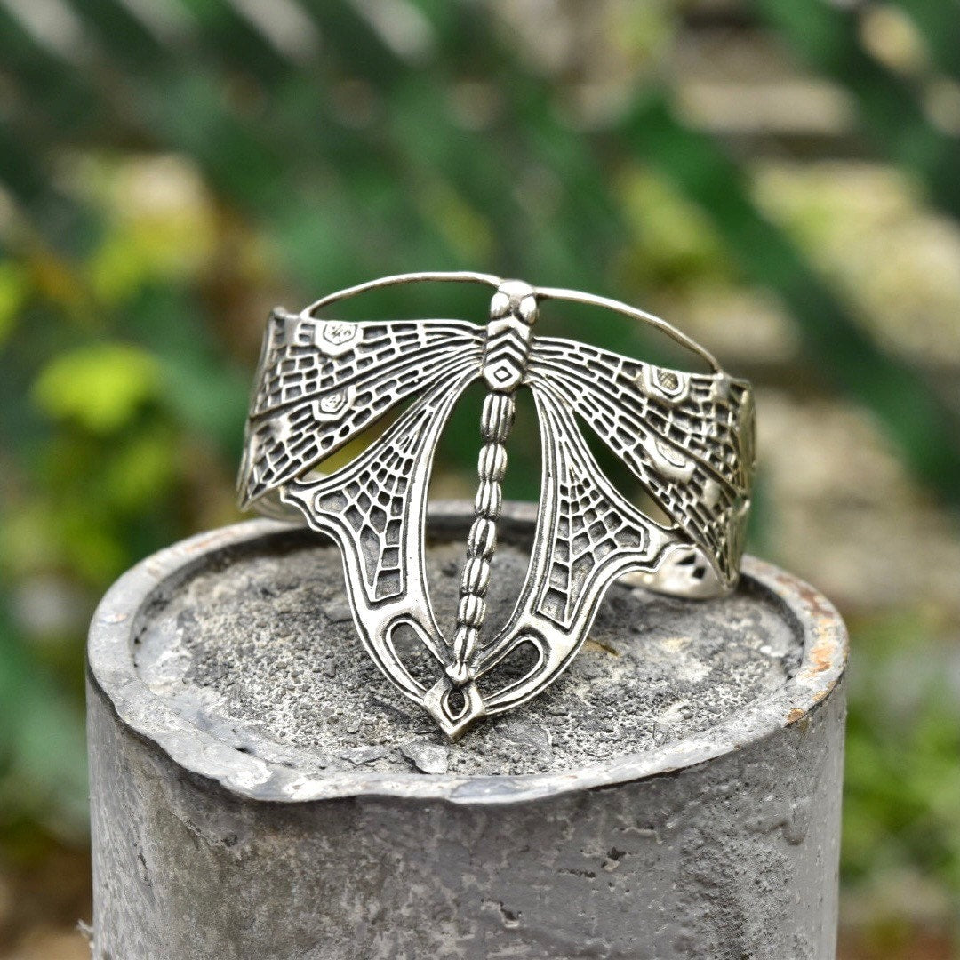 Vintage Sterling Silver Dragonfly Cuff Bracelet, Art Nouveau, Engraved Silver Butterfly Cuff, WTS 925, Adjustable, 5 1/4"