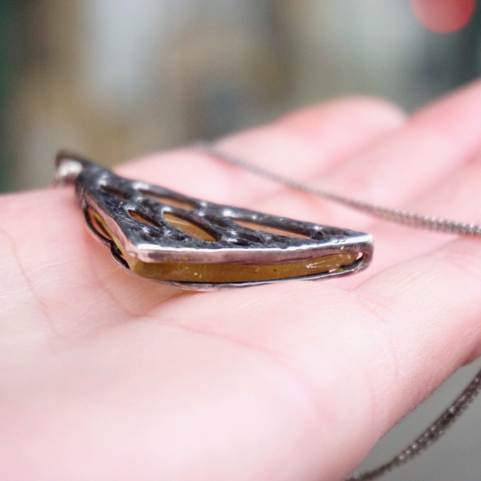 Pendant measures 2 1/4" H (including necklace loop) x 1 1/2" W (base of triangle)